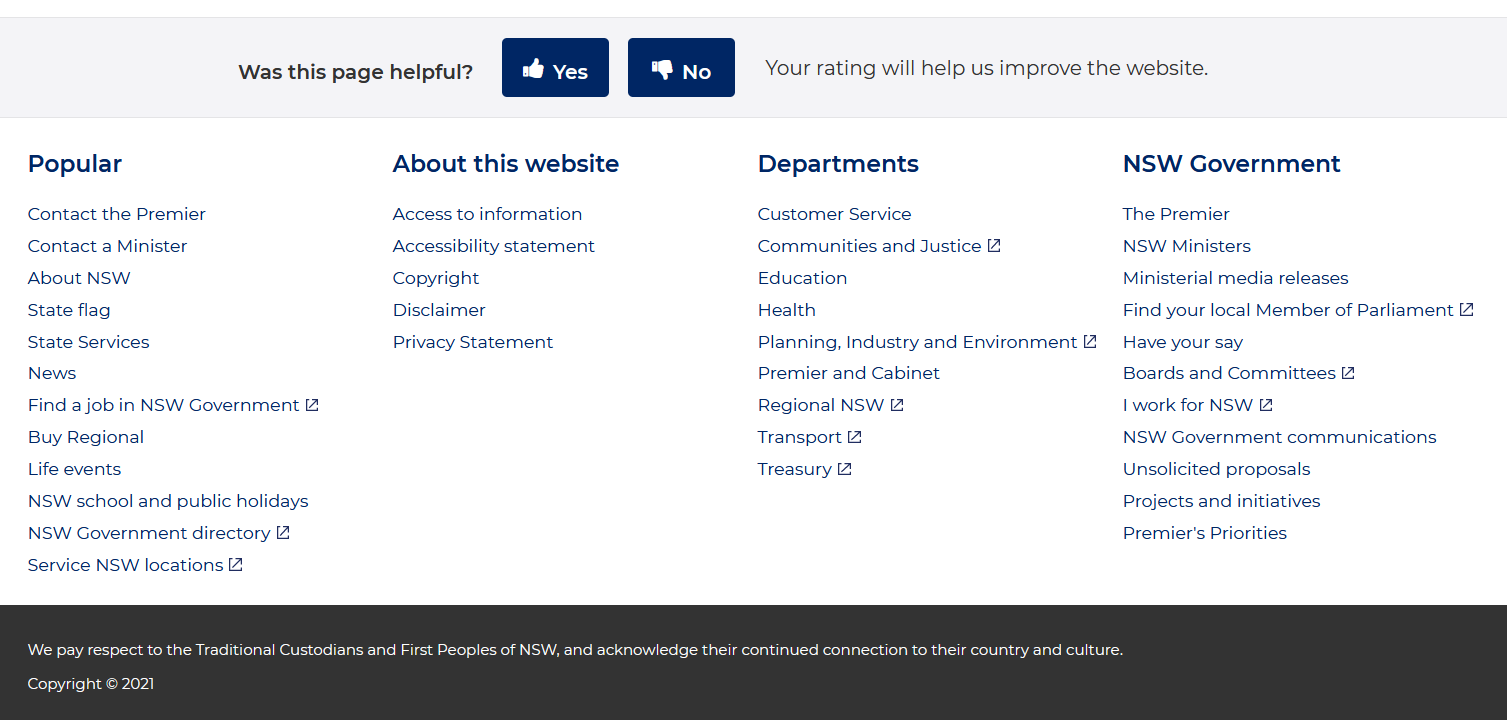 While the nswhvam website contains links to NSW health and ServiceNSW, it lacks the standardised website footer navigation panel: