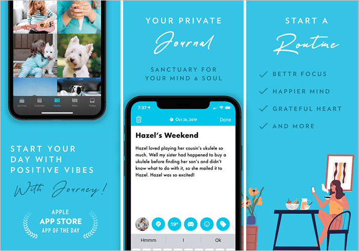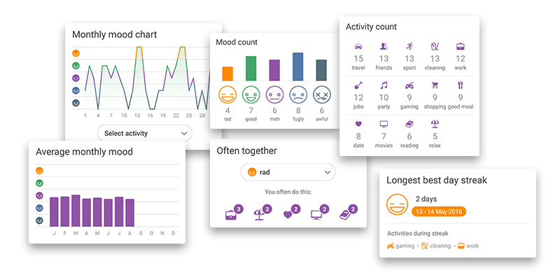 Daylio is the perfect solution for those always on the go. The ‘journal’ entries don’t require any writing at all – it can essentially be used to exclusively track mood and habits. The data visualisation for mood tracking is vastly superior as well, with customisable chart, graph and calendar views. Journey is a different app that serves a different purpose: to write journal entries, with the ability to attach all kinds of data to them.