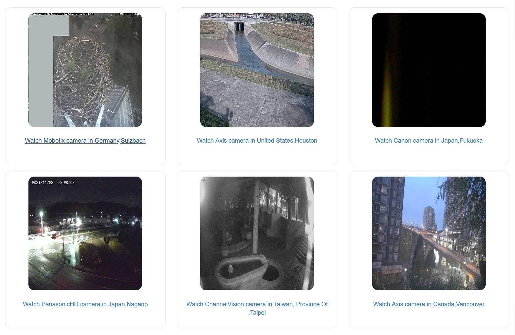 Six cam stream previews are shown per page, and these camera streams include anything and everything from kitchens, restaurants/cafes, retail shops, office floors, bird nests, and many more. The amount of variety is overwhelming, allowing you to sort by Manufacturer, City, Country, Timezone, Popularity and New online cameras.