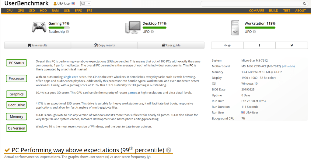 It’s easy to use and speedy (takes ~2 mins to run) – but isn’t perfect. Take the benchmark scores with a grain of salt as the results aren’t entirely accurate (all data is user data, which includes benchmarks from all over the spectrum including poorly optimised systems to freshly built PCs).