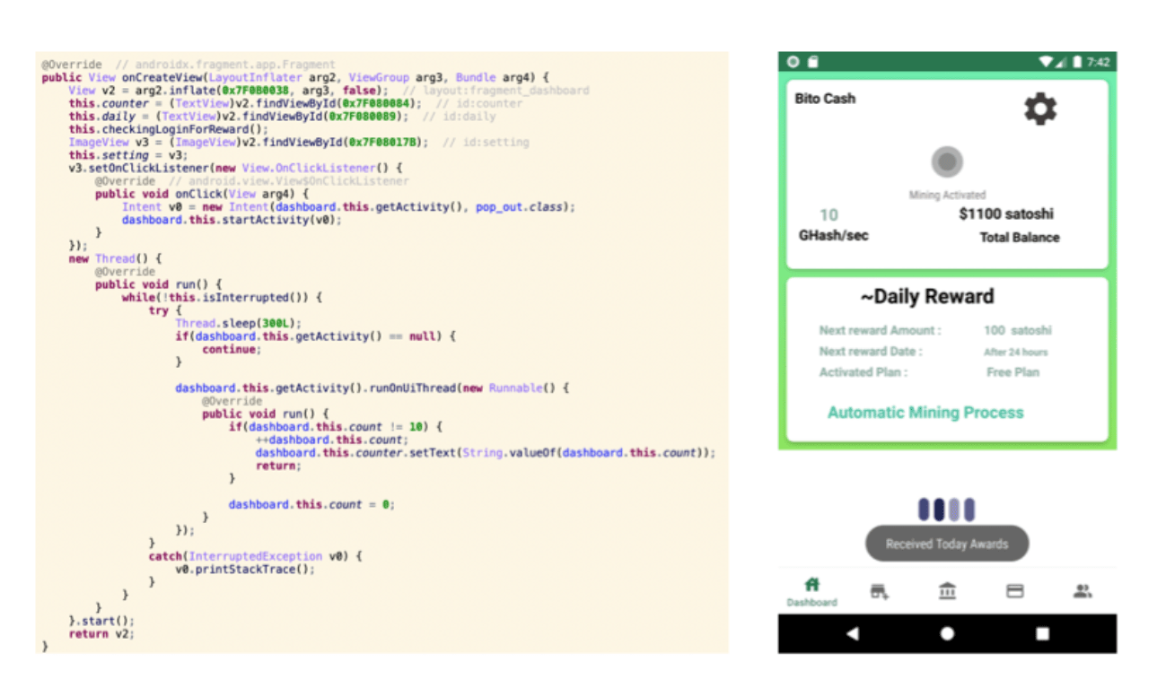 In fact, these apps were entirely bogus apps doing nothing at all: Lookout’s findings revealed that in one app called “BTC Cash”, the displayed “GHash/sec” (the mining rate) is a counter that resets each time it counts to ten.